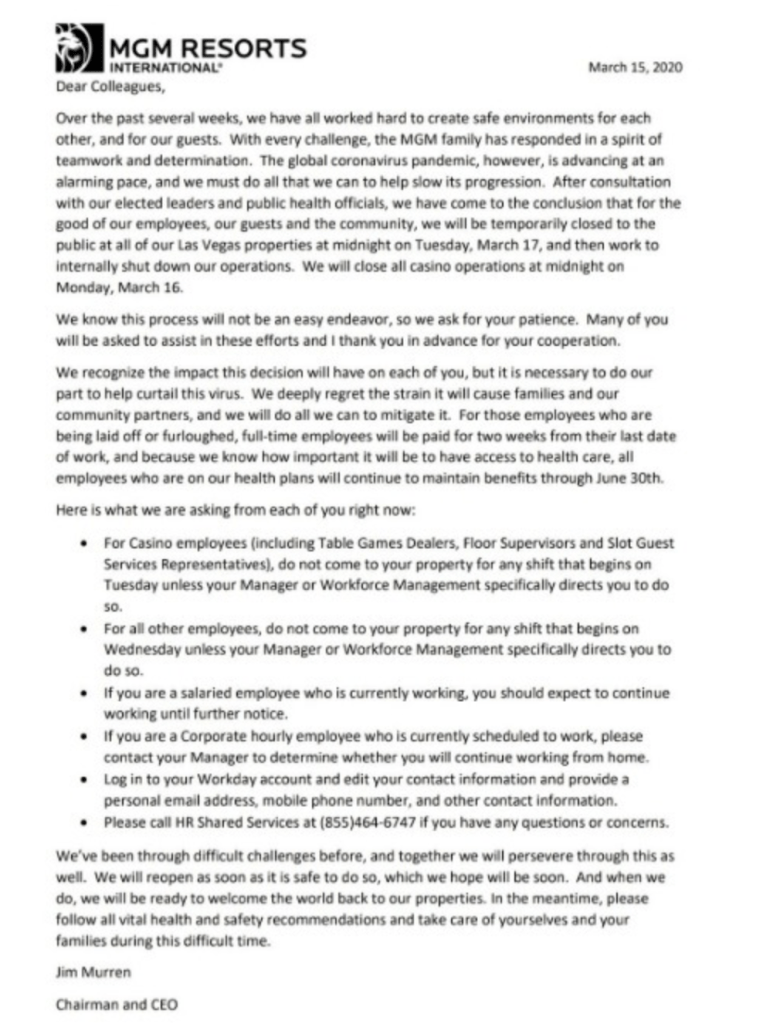 Just a few hours later MGM Resorts announced that it would close all casino operations at Las Vegas resorts as of midnight, March 16, 2020.