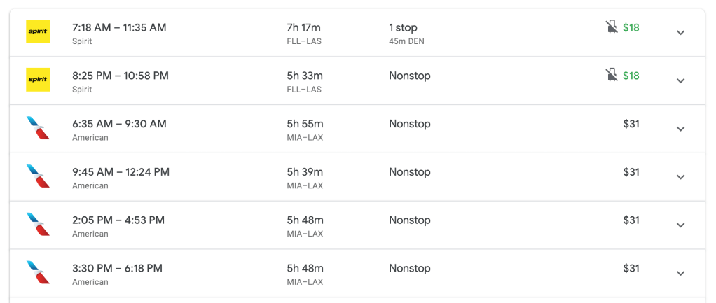 Depending on your need for “unique” experiences (i.e. pain), seeing prices on on Spirit from Fort Lauderdale to Las Vegas at just $18 has been just cruel to see! You can also pay $31 for American Airlines to fly non-stop from Miami to Los Angeles but I’m not sure the experience will be much better given that it is American. 🙄