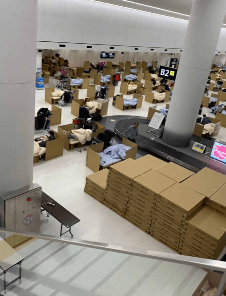 Passengers are sleeping in makeshift cardboard box accommodations, provided by the Japanese Government, until travelers can (hopefully) return a negative test result for coronavirus. The test takes approximately 2 days and cost 15,000 yen ($140 USD).