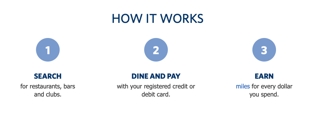 Let’s say that I am interested in accumulating Delta Skymiles. I register a credit card under the Delta Skymiles Dining Program, I look for restaurants that are associated with Delta Dining. When I eat at the restaurant, I will receive, say, 5 miles for each dollar that I spend at that restaurant.