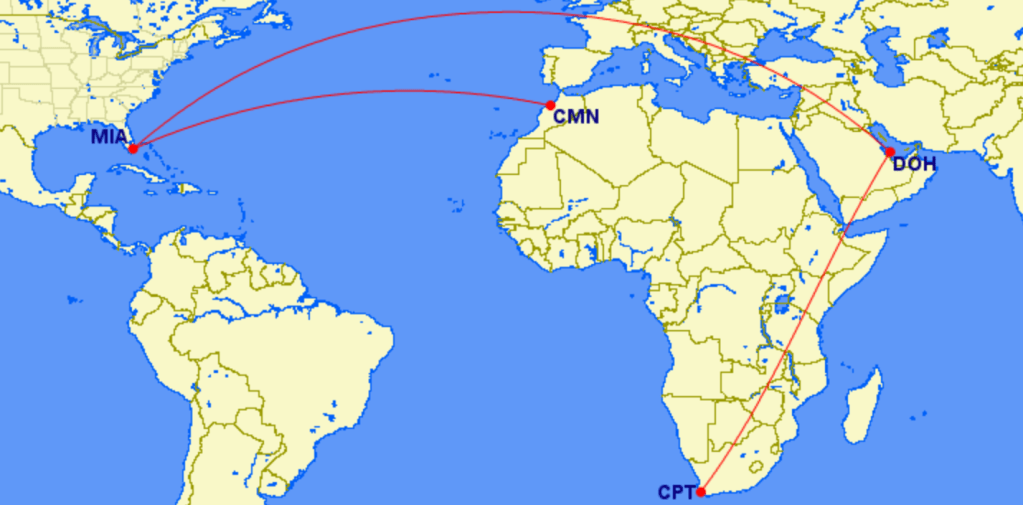 - pay 75,000 miles to fly one-way in business class on Qatar Airways (and likely in Qsuites) from Miami to Doha to Capetown (a total of ~25 hours)?