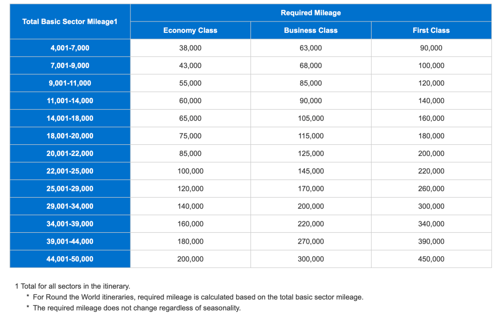 The exact amount of miles required for your RTW ticket will be completely dependent on the total length of your trip (in miles) and ANA provides a simple, user-friendly award chart to calculate how many points will be required. The chart reads as follows:
