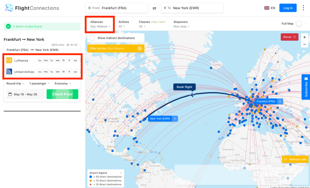 Another great resource that I use frequently is FlightConnections.com. The search engine provides all the available options between cities and will even allow you to narrow it down the alliance (Star Alliance in this case).