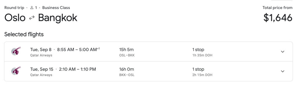 One sweet spot that comes to mind is Oslo-Bangkok (via Doha). This route often goes on sale and I’ve seen this route as low as $1100.