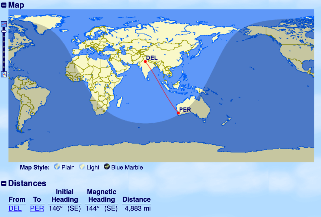 For simplicity, 5,000 miles = 4344 nautical miles. Don’t worry, there won’t be any more math in this post. Using GCmap.com, I can determine the 4344 nautical mile radius and change my destination to any airport found within the light blue section.
