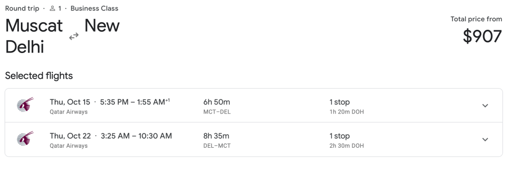 Let’s take a look at Muscat to Delhi (via Doha) in business class…