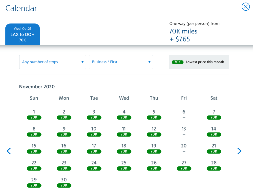 In that case, you would never see Qatar Airways’ availability displayed because the calendar only displays the lowest price, in this case 69K. So you would have to manually choose a date and see if Qatar had availability. If Qatar was not available on that date, you would have to begin the entire award search over again which is frustrating and time consuming.