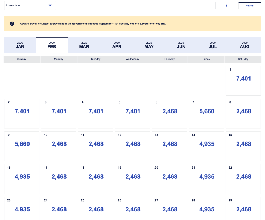 So I quickly toggle from the “$” tab to the “points” tab at the top of the screen and see that my flight has decreased to 2,468 points each way.