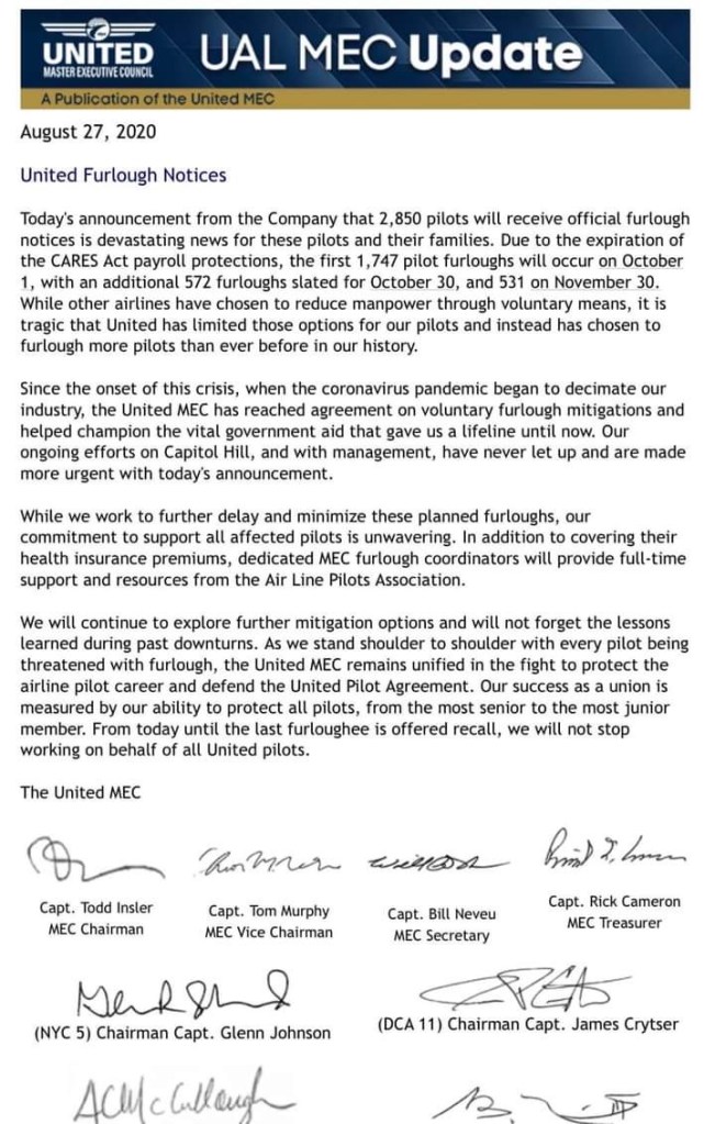 United has stated the first 1,747 pilot furloughs will occur on October 1, with an additional 572 furloughs slated for October 30, and 531 on November 30, which is a total of 2,850 pilots.
