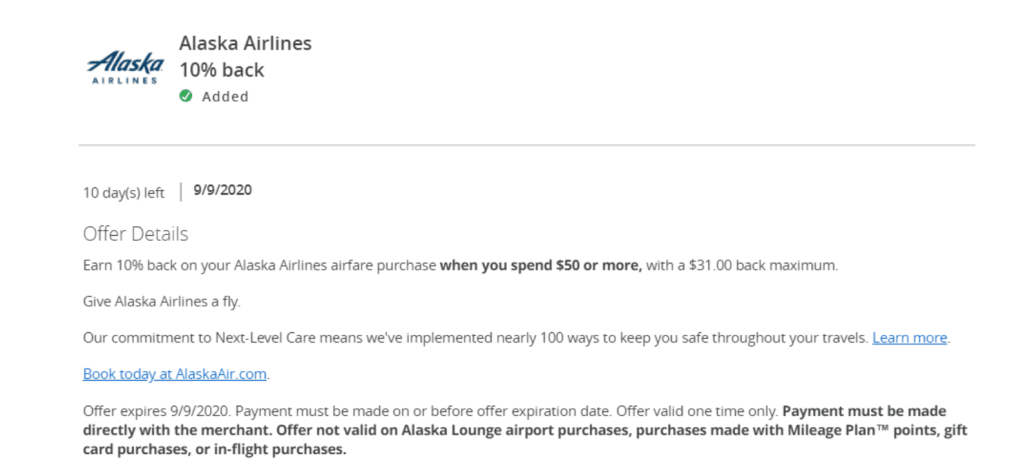 A large proportion of my annual expenses are spent on travel and food so discounts in these categories are important. With this Chase Offer, you can earn 10% back on your Alaska Airlines purchase when you spend $50 or more (with a $31.00 back maximum). In other words, the offer tops out with a purchase of $310.