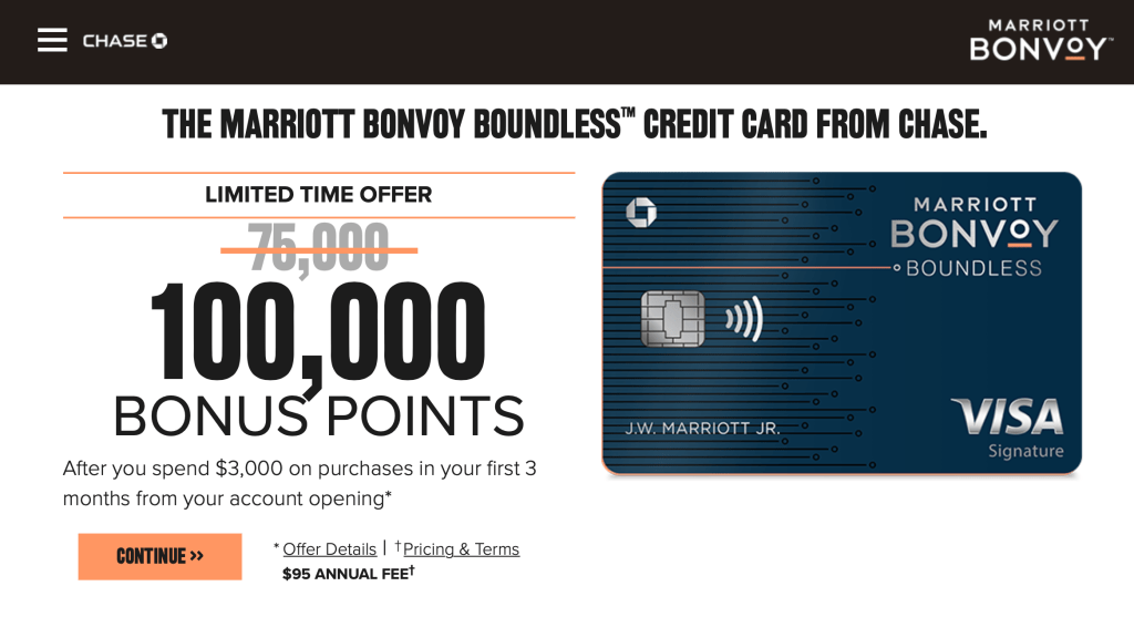 It appears Chase is offering an increased welcome bonus on the Marriott Bonvoy Boundless card of 100,000 points after $3,000 in spend. If you are interested in accumulating Marriott Bonvoy points, here are some things to consider: