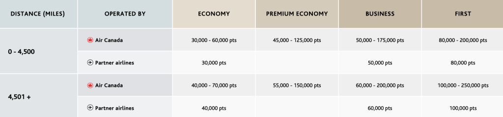 | On Air Canada: Vancouver (YVR) – London (LHR) | 55,000 | $584.16 CAD ($446.81USD) | 70,000 | $38.98 |