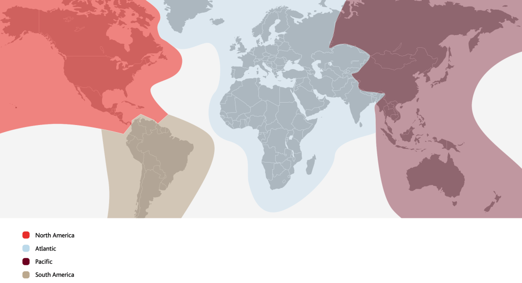 The new Aeroplan award chart is split up into four regions or what Aeroplan calls “Travel Zones:” North America, Atlantic, Pacific and South America. Each of these regions has distance-based awards for flights departing from one region and arriving in another and for flights within one region. In other words, a flight from Toronto (YYZ) to London (LHR) will cost less than a flight from Houston (IAH) despite being in the same “zone.”