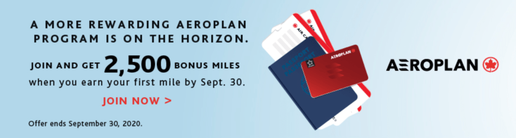 As reported by One Mile At A Time, Aeroplan is offering 2,500 bonus miles if you join Aeroplan through THIS LINK and earn your first mile by September 30, 2020.