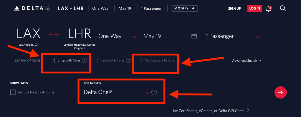 STEP 2: Enter your Origin, Destination, dates (I would select one-way), check the “shop with miles” box, check the “my dates are flexible” box, select Delta One (aka business class), and search.