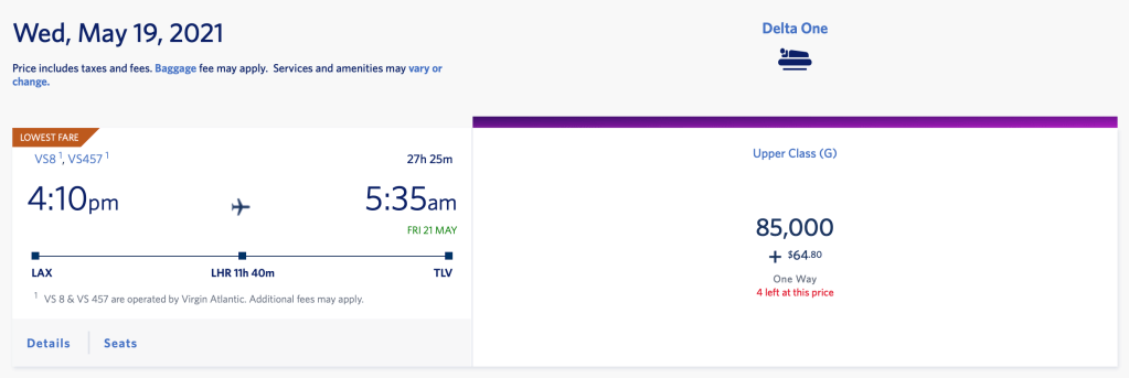 A. 85,000 SkyMiles (Yes, it cost less miles to continue to another city. Interestingly, this specific itinerary has a 12-hour layover in London; 2 cities for the price of 1!)