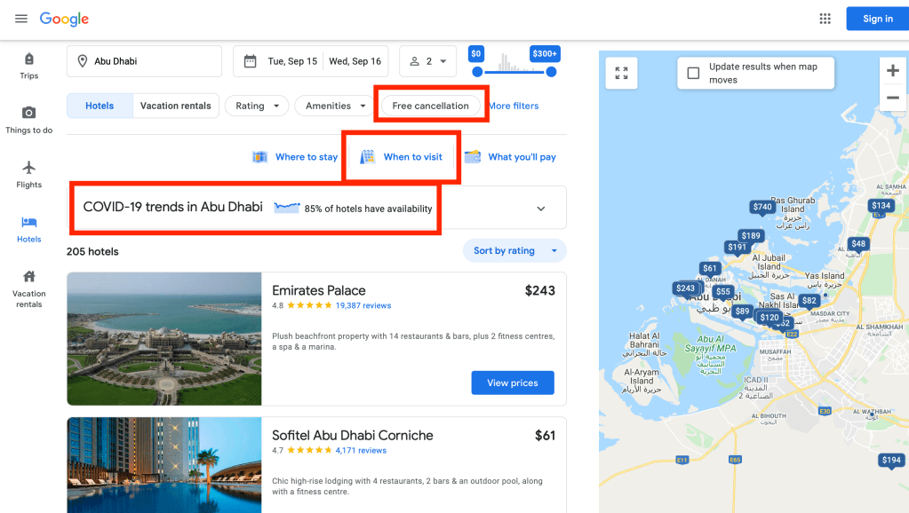 After entering my destination (Abu Dhabi), I was able to see which accommodations offered free cancellations, the percentage of available hotel rooms, and perhaps the most important information, the COVID-19 trends in the city.