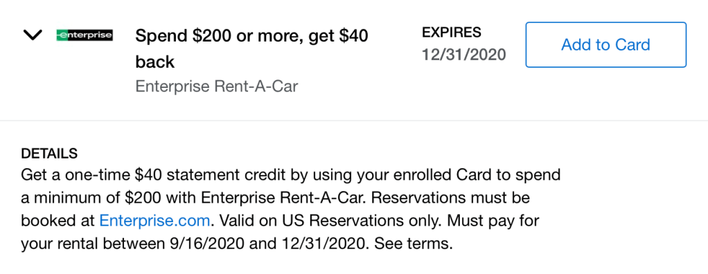 Currently, there’s a new targeted Amex Offer to save $40 when you spend $200 at Enterprise Rent-A-Car. This offer is valid for bookings through 31 December 2020.