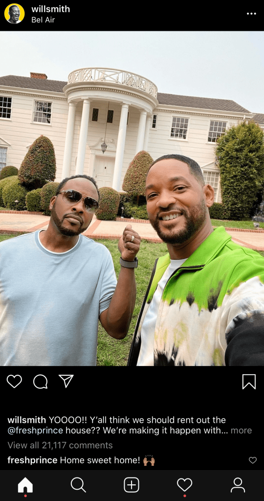 On Sunday, the actor announced on Instagram that the mansion featured on the “The Fresh Prince of Bel-Air” would be made available for rent on Airbnb.