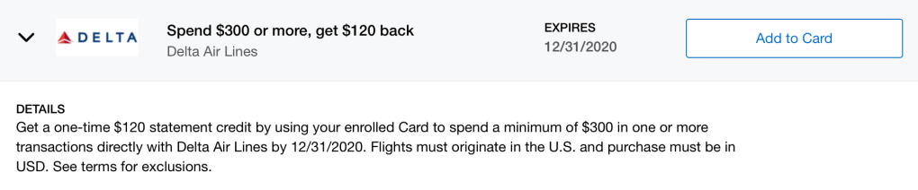 There’s currently a new targeted Amex Offer to receive a one-time $120 statement credit by spending a minimum of $300 in one or more transactions directly with Delta Air Lines by 12/31/2020. That’s a savings of 40%!!