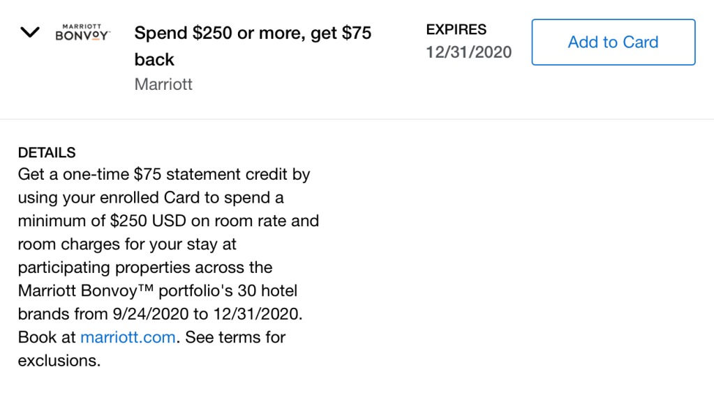 There’s currently a new targeted Amex Offer to receive a $75 statement credit after spending $250 (or more) at Marriott by 31 December 2020.