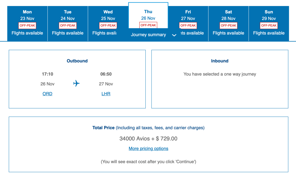 If you curious about the surcharges/fees, here’s an example. A one-way flight from Chicago (ORD) to London (LHR) in first class can be booked for 34,000 Avios + ~$730USD.