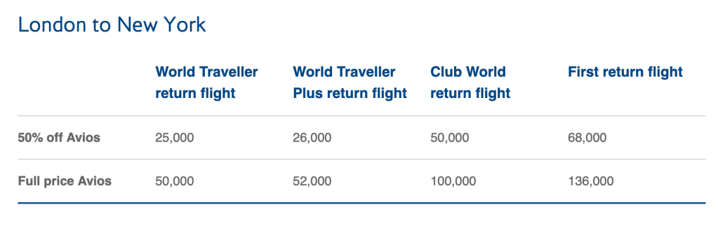 - New York – London: 25,000 miles one-way (business class aka Club World)