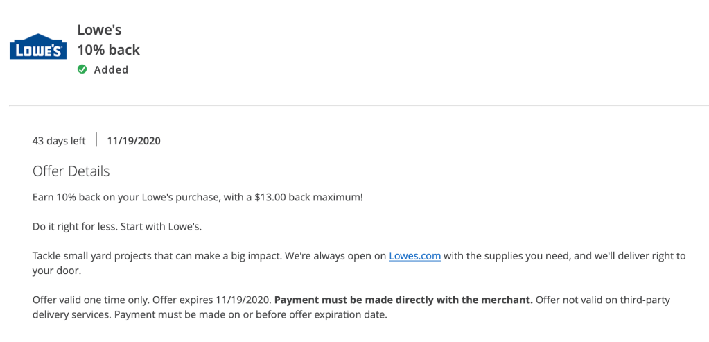 With this Chase Offer, you can earn 10% back on your Lowe’s purchase (with a maximum of $13.00 back). In other words, the offer tops out with a purchase of $130.