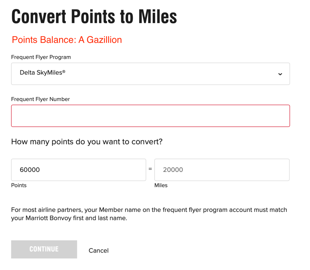 Caveat#1: I’m not sure why it would be different, but for most airline partners, your member name on the frequent flyer program account MUST MATCH your Marriott Bonvoy first and last name or the transfer will not be processed.