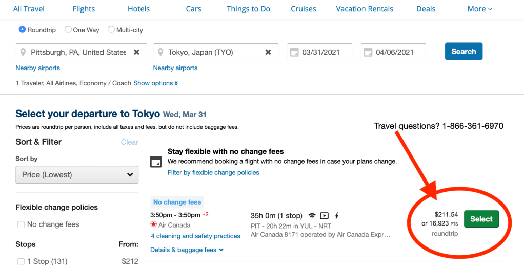 You’ll notice that you can “purchase” the ticket by charging $211.54 to your credit card OR by redeeming 16,923 points.