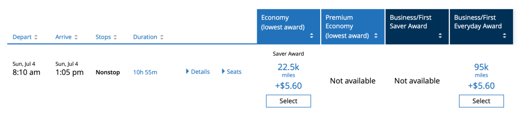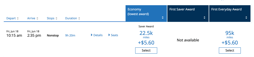 Award Availability: Similar to the Maui (OGG) route above, saver award availability in business class in non-existent but economy is widely available at 22,500.