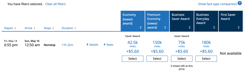 Award Availability: Unfortunately, saver award availability in business class in non-existent but economy is widely available, the lowest business class award on most dates starts at 95k.