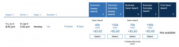 Award Availability: Interestingly, two weeks ago I wrote that business class availability was wide-open. Well, it appears a lot of people were interested because it has vanished! But here are the rates…