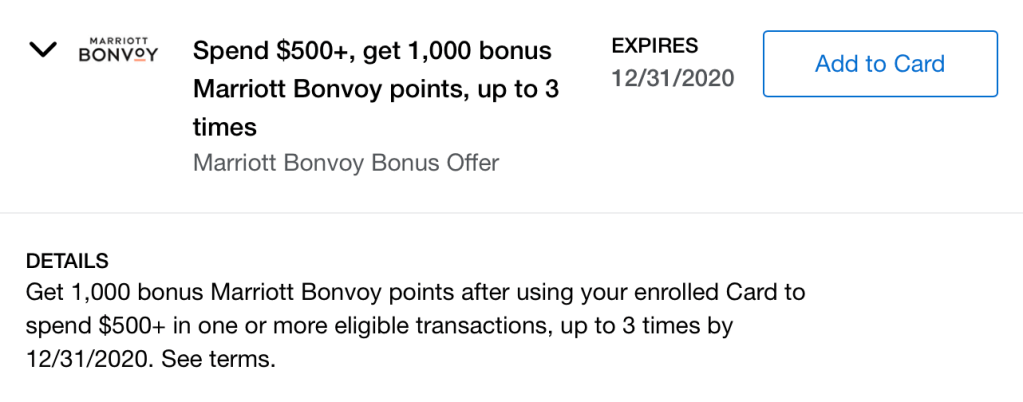 Over the past few weeks, Amex has continued to drop even more great offers. For example, there’s currently a new targeted Amex Offer to receive 1000 Marriott Bonvoy bonus points after spending $500. The offer expires on 31 December 2020 and can be completed up to 3 times.