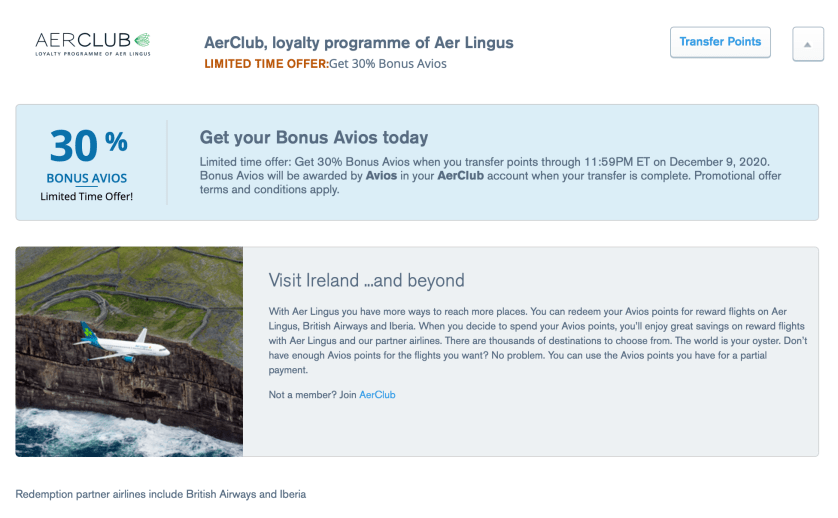 …a 30% bonus when you transfer your points to Aer Lingus through 9 December 2020 (inclusive)…