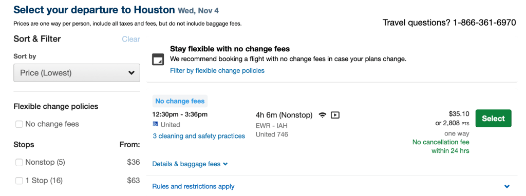 Newark (EWR) to Houston (IAH) for ~2800 points on United Airlines…