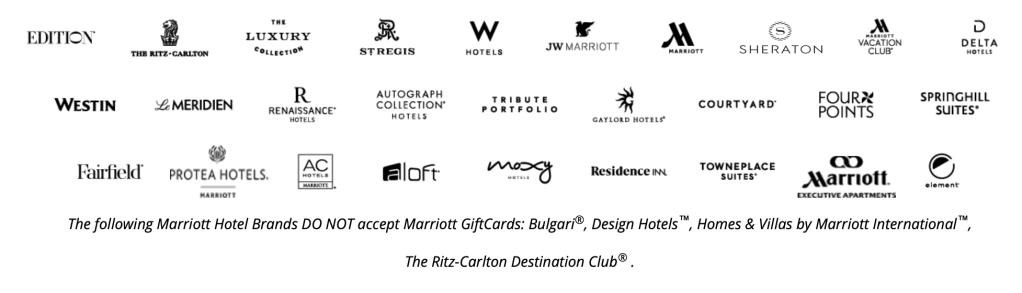 - The following Marriott Hotel Brands DO NOT accept Marriott GiftCards: Bulgari, Design Hotels, Homes & Villas by Marriott International, and The Ritz-Carlton Destination Club